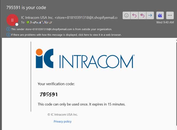 Check your email inbox for an email from IC Intracom USA Inc., with the subject "xxxxxx is your code". Copy this code, as you will need it in the next step.