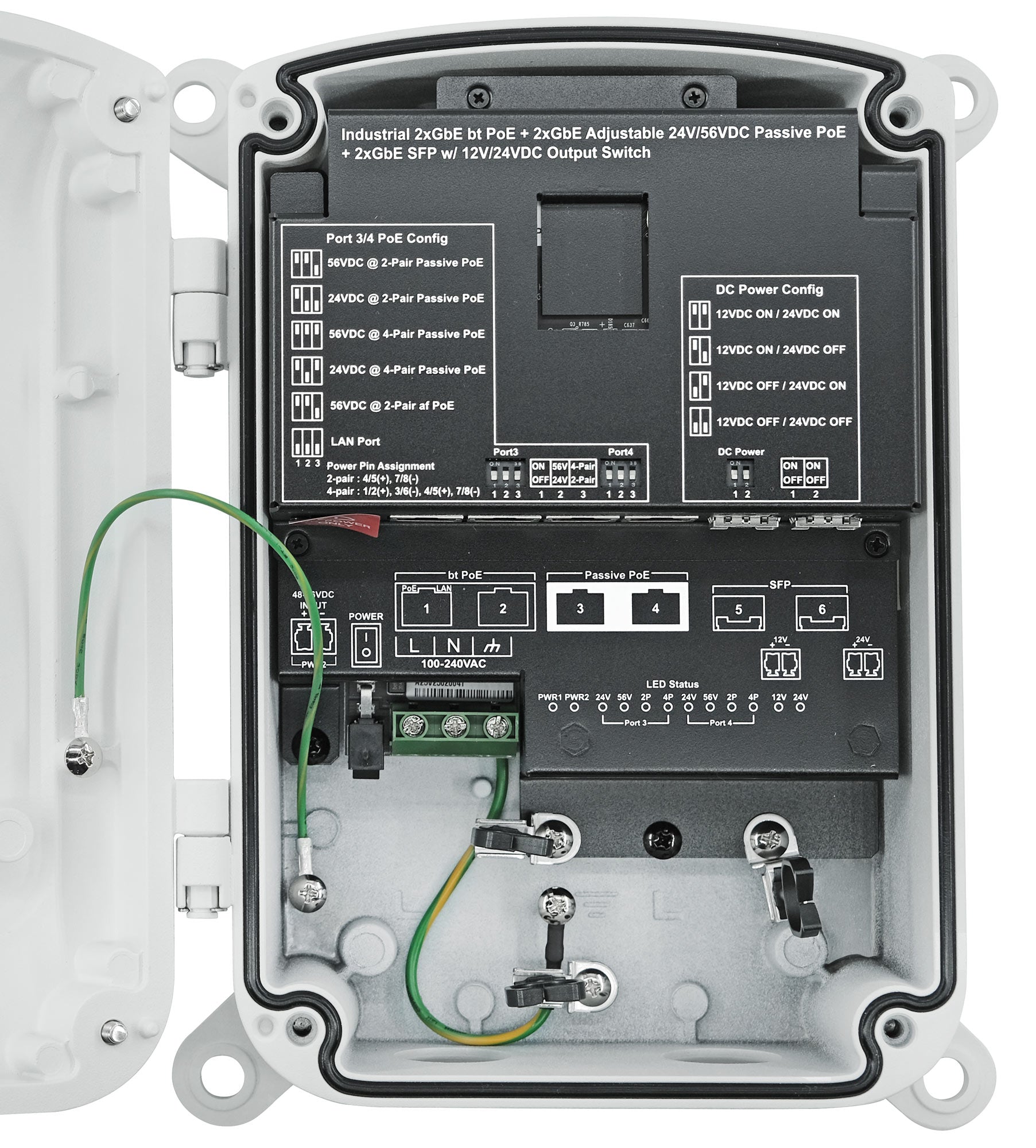 - Two Adjustable 24V/56VDC Passive PoE Outputs to support 24V/56VDC Passive PoE Wireless nodes